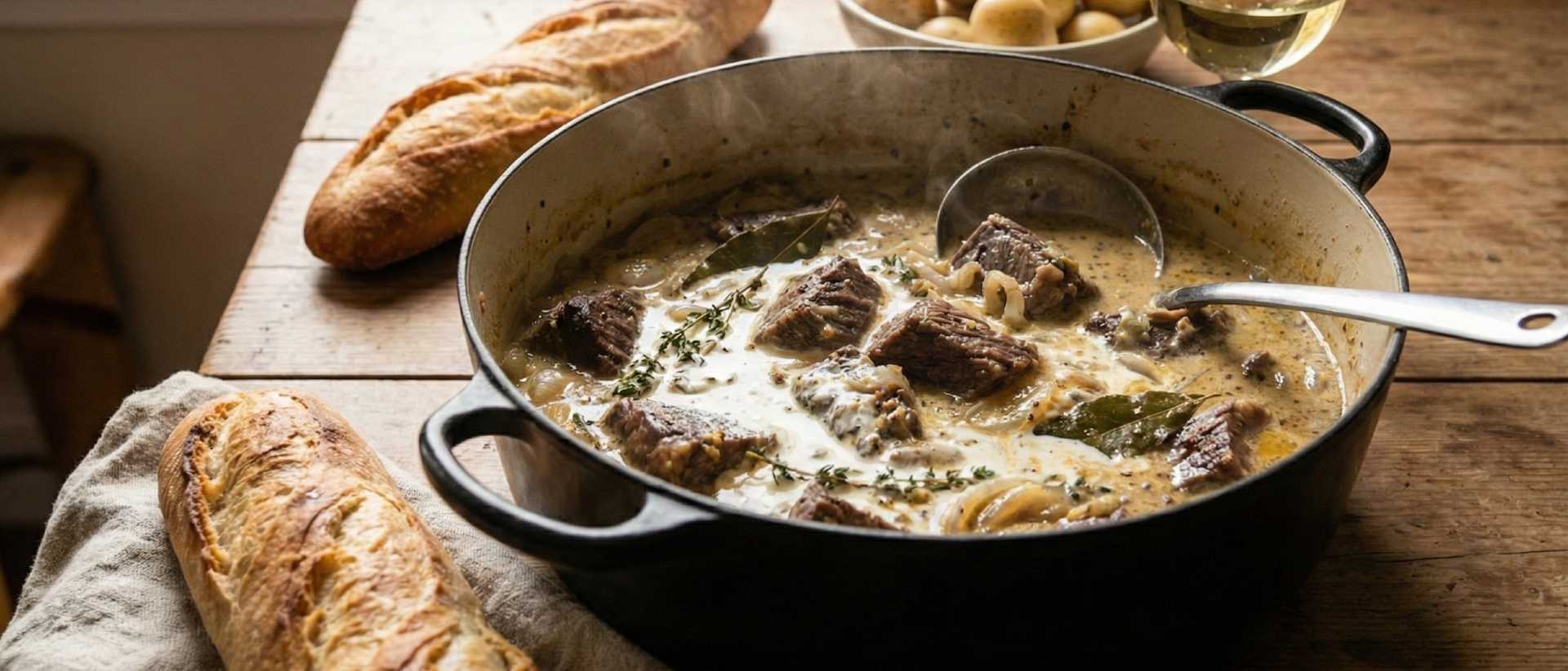 A gentle, reassuring stew built around beef skirt, Dijon mustard and soft onions. The wine and herbs give it a lifted, almost bistro feel, while the touch of cream rounds everything out. It’s a dish that works well for a weekend pot on the hob or a quiet midweek supper.
