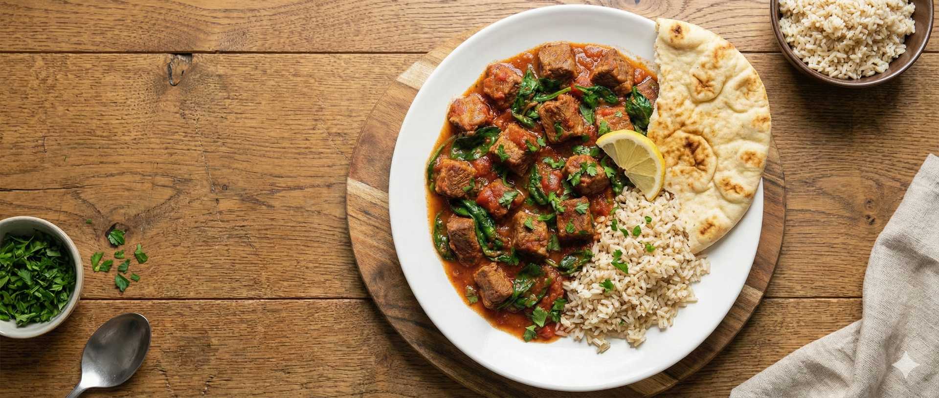 This is a calm, everyday lamb dish built around diced Yorkshire lamb, cooked gently with tomatoes, warming spices and finished with spinach. It’s not a curry and not a heavy stew — just steady cooking that lets the lamb carry the dish while keeping everything balanced and January-friendly.