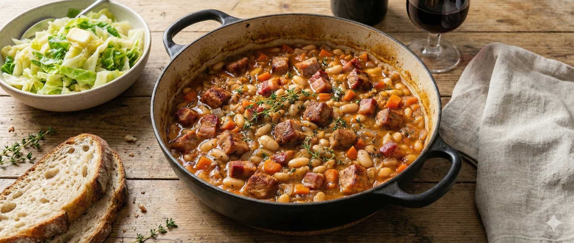 This is a restrained, winter cassoulet built around diced pork and smoked bacon, cooked slowly with white beans, onions and herbs. The bacon provides savoury depth without needing added fat or breadcrumbs, while the beans thicken the dish naturally. It’s warming and sustaining, but still measured and balanced — well suited to January cooking.