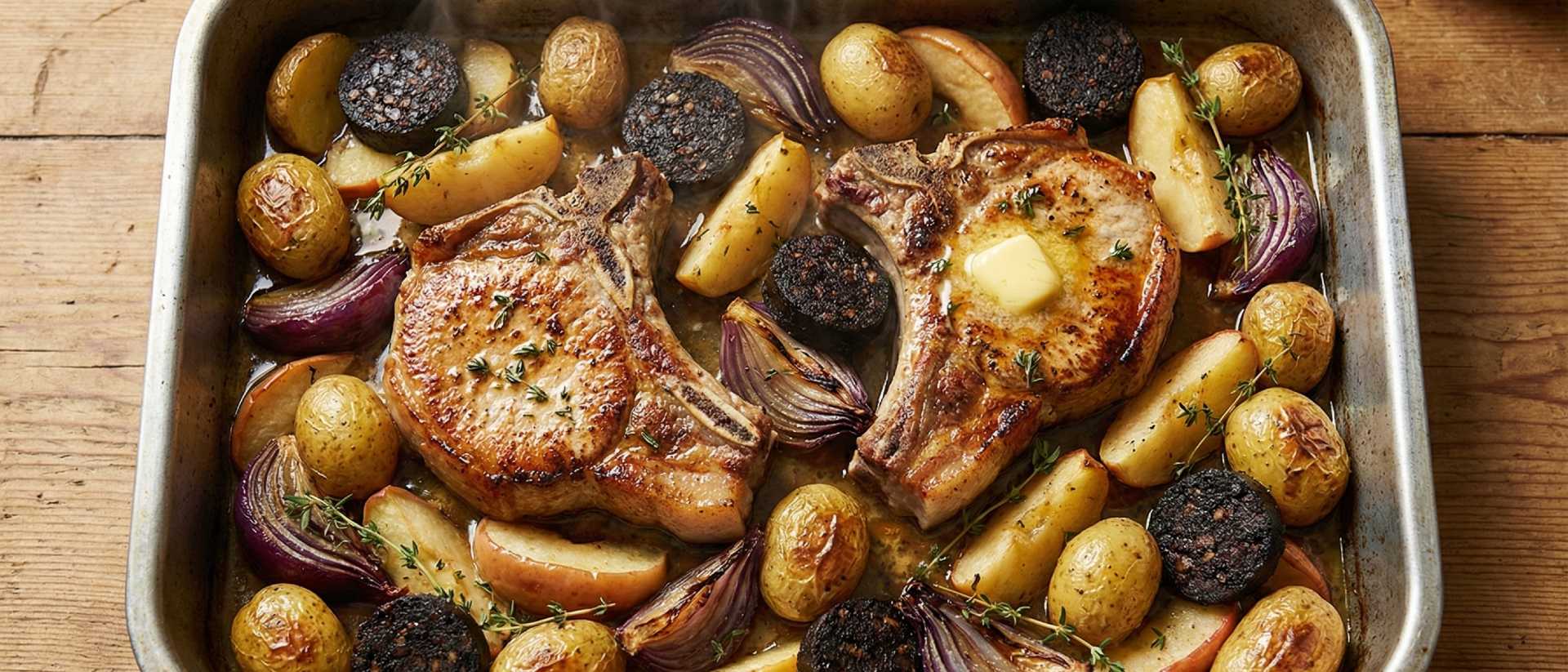 A rustic, one-pan supper that celebrates the richness of native-breed pork. Thick-cut pork chops roast with potatoes, apples, and black pudding for a dish that’s both hearty and beautifully balanced — a true taste of the North.