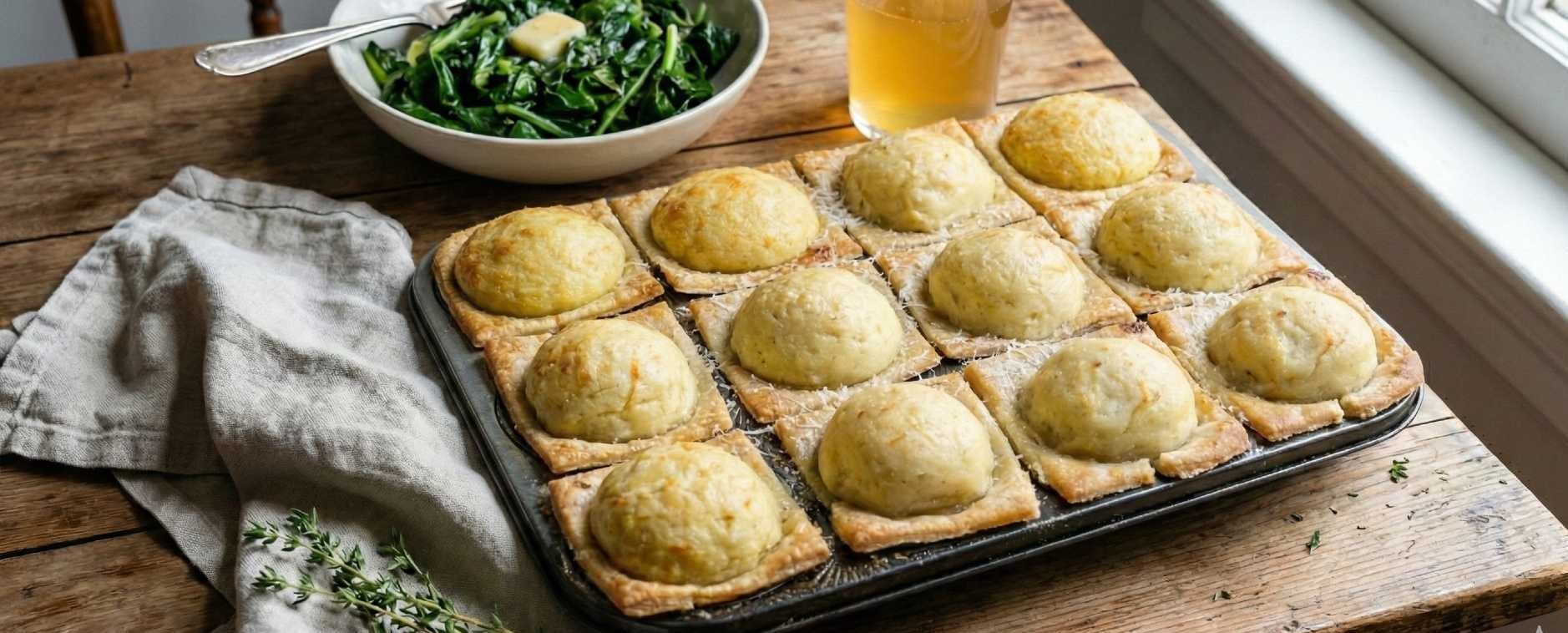 These pressed-tray chicken pot pies are a practical, very British take on comfort food. A crisp lard crust pastry forms neat individual wells, filled with a rich chicken thigh pie filling and topped with firm parmesan mash, all baked as one slab and cut into portions.
