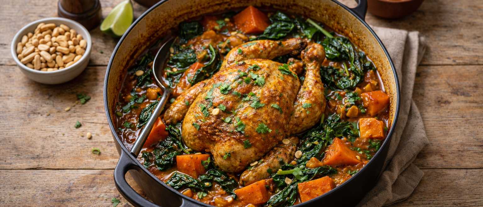 This is a slow, comforting one-pot chicken inspired by West African cooking, where peanuts, tomatoes and spices are used to build warmth and depth. The chicken cooks gently until tender, enriching the sauce as it goes, while sweet potatoes and greens turn it into a complete, sustaining winter dish.