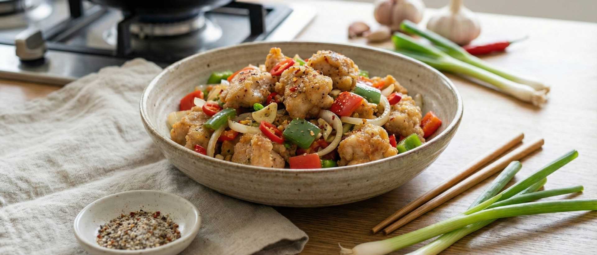 A crisp, lively stir‑fried chicken dish inspired by the classic takeaway version. Lightly battered chicken, colourful peppers, garlic and chilli are tossed together with a homemade salt-and-pepper seasoning that is far fresher than anything shop‑bought.