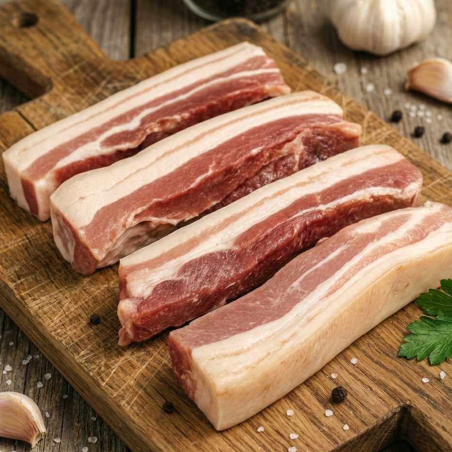 Sourced from farms dedicated to sustainable, humane practices, these pork belly strips reflect a commitment to quality, flavour, and a respect for traditional farming methods.