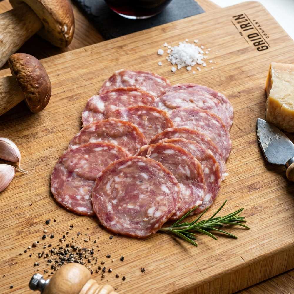 This is a proper charcuterie-board salami — earthy from the porcini, rounded by the red wine, and balanced with the gentle richness of pork and cheese. It works beautifully as part of a grazing spread with hard cheeses, pickles, and good bread, but is equally good sliced simply for drinks and nibbles.