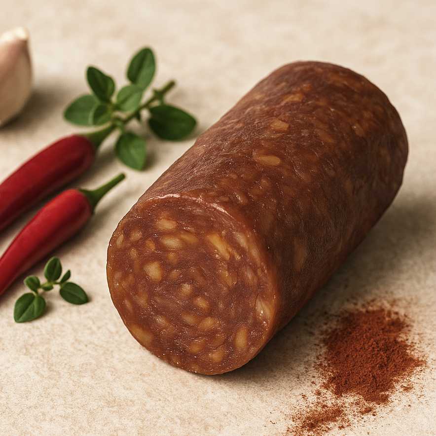 The result is a chorizo that’s smoky, spicy, and full of umami — ideal sliced thinly for charcuterie boards, folded through pasta or risotto, or crisped gently in a pan to release its paprika-rich oils.