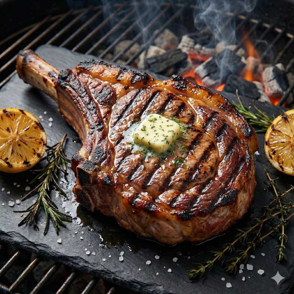 Dry-aged Cote de Boeuf is best enjoyed with simple seasoning, typically just salt and pepper, to allow the natural flavours to shine. It’s commonly cooked on high heat, either on a grill or in a hot skillet, to develop a seared crust while keeping the interior juicy and medium-rare.