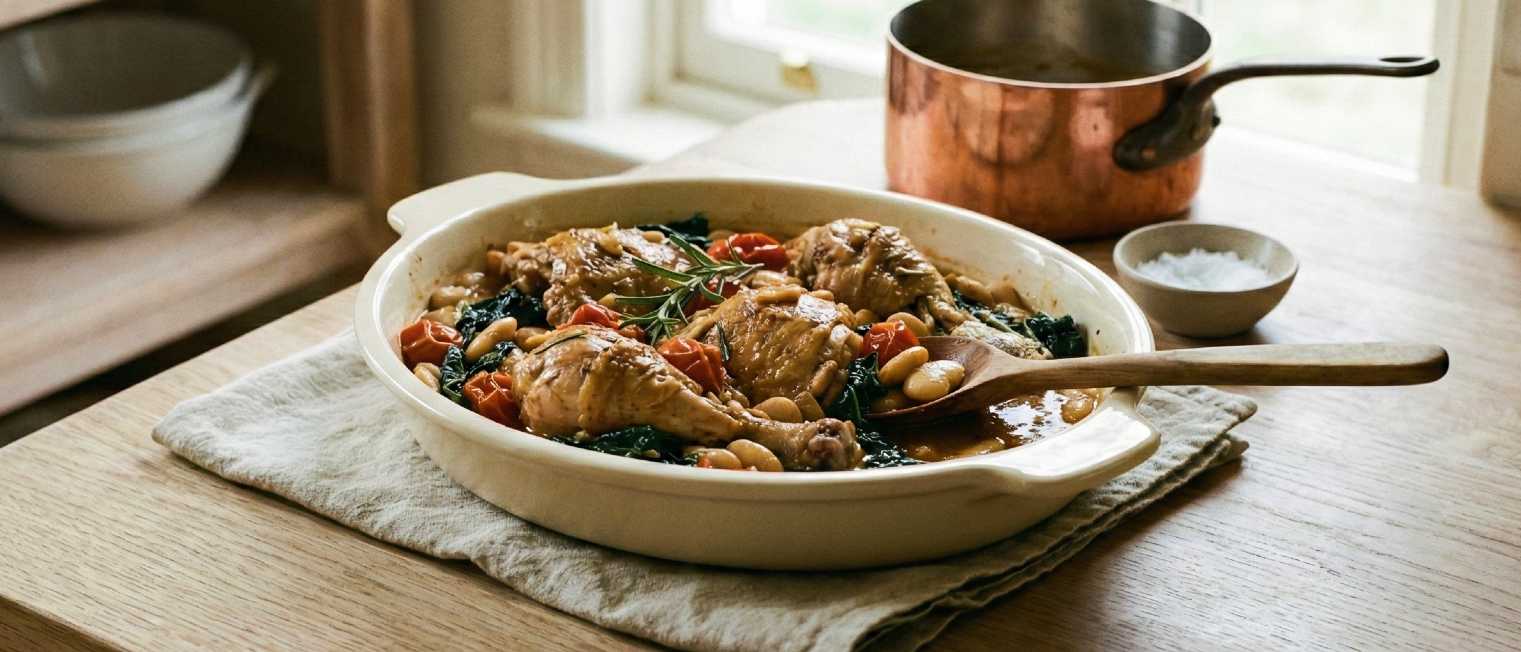 A rustic, spoonable whole chicken dish that leans on slow braising rather than roasting. Jointed chicken is gently cooked with garlic, white wine, tomatoes and rosemary until tender, before being finished with butter beans and cavolo nero for fibre and body. It is deeply comforting, collagen-rich and satisfying without the need for pasta or bread.