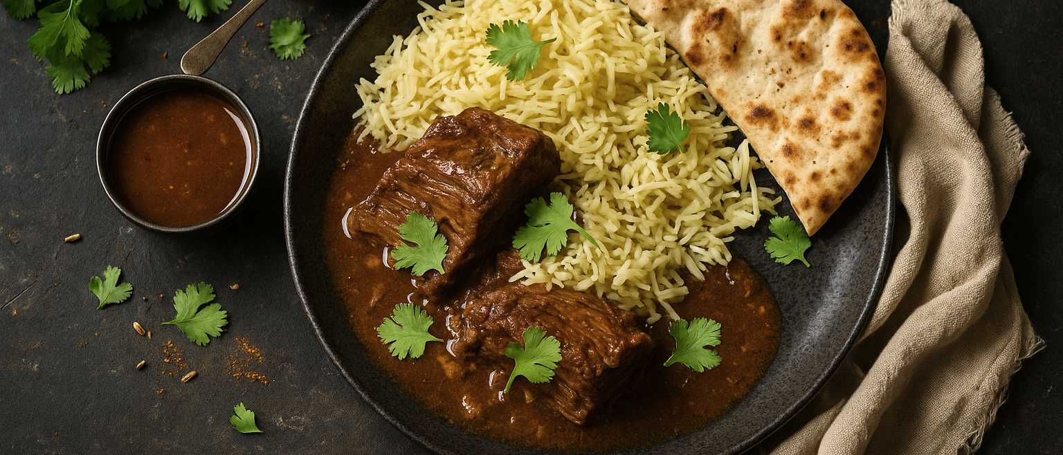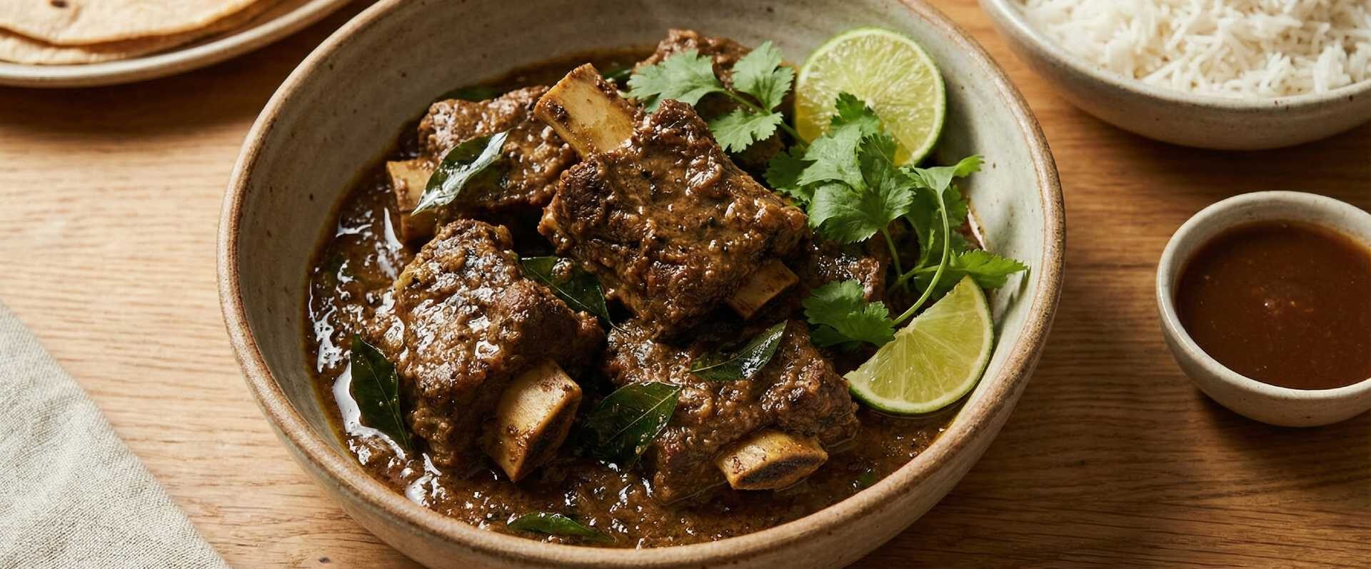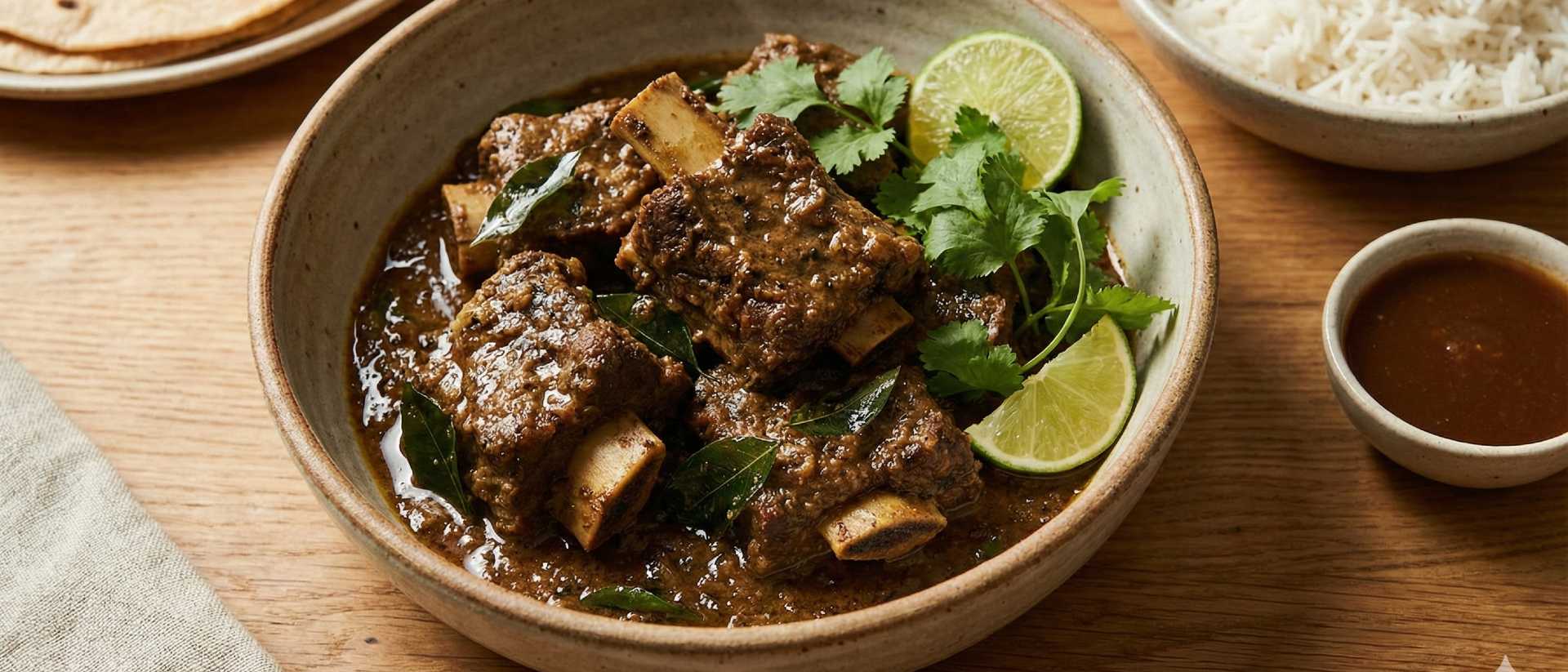 This slow-cooked short rib curry draws inspiration from Kerala’s coastal kitchens, where coconut, curry leaf, and black pepper take centre stage. The beef cooks on the bone until tender and yielding, in a sauce that’s aromatic, creamy, and layered with spice and warmth. Tamarind adds a gentle sour note that keeps the richness in check.