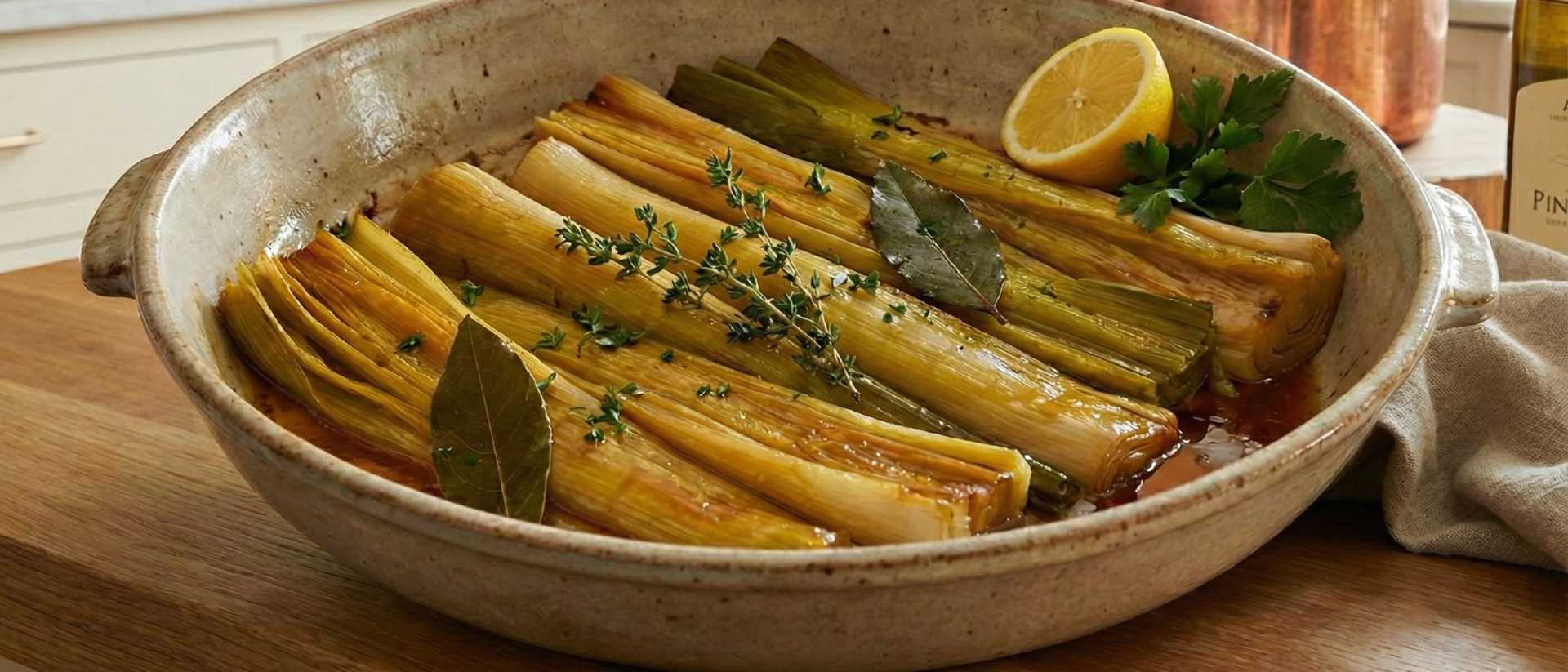 Braised leeks are one of those quiet stars of the table: soft, gently sweet and full of buttery richness. Slow cooking in a little stock brings out their natural tenderness, while a final gloss of butter and herbs lifts them into something special.
