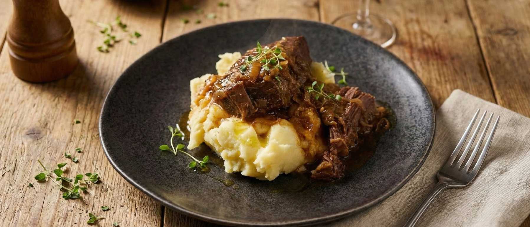 This is a steady, traditional braise built around chuck steak — a cut that rewards time and gentle heat. The onions soften and melt into the cooking liquor, the beef becomes spoon-tender, and the finished dish is warming and satisfying without being heavy.